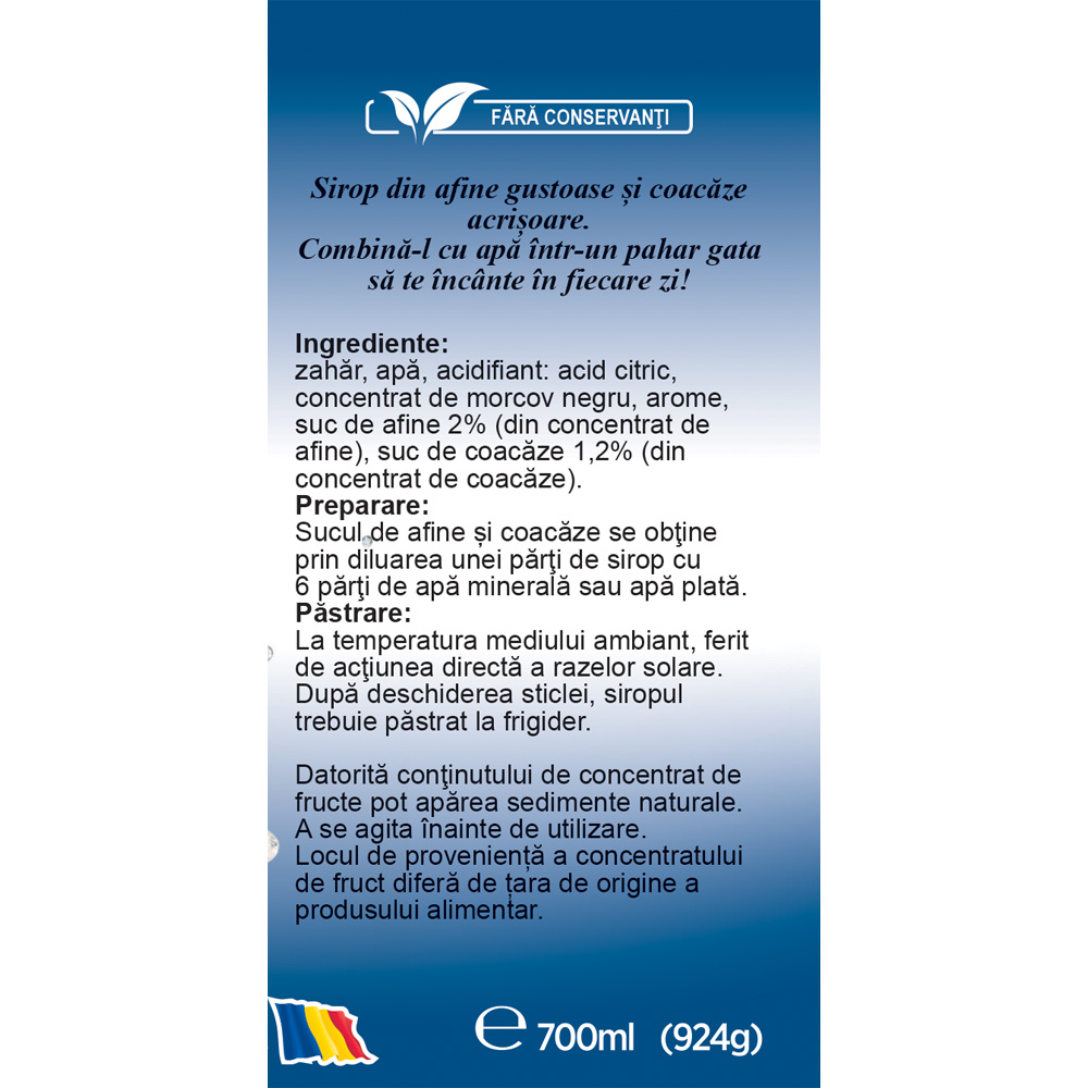 Preparare: Sucul de afine și coacăze se obţine prin diluarea unei părţi de sirop cu 6 părţi de apă minerală sau apă plată.