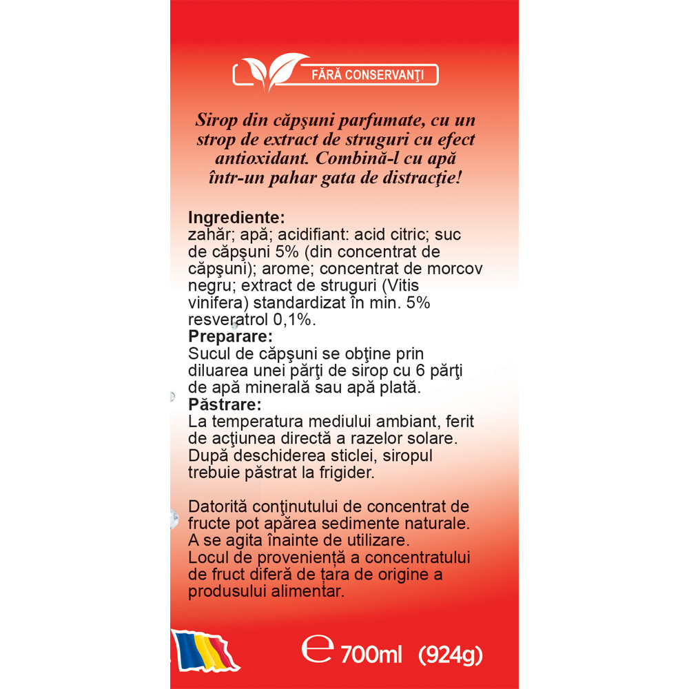 - sirop din căpşuni parfumate, cu un strop de extract de struguri cu efect antioxidant;