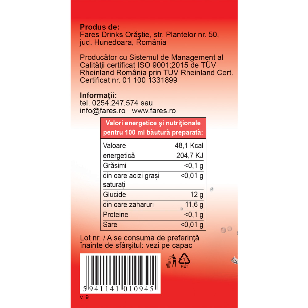 Valori nutritionale:Pentru 100 ml băutură preparată: Valoare 48,1 Kcal energetică 204,7 KJ Grăsimi <0,1 g din care acizi grași <0,01 g saturați Glucide 12 g din care zaharuri 11,6 g Proteine <0,1 g Sare <0,01 g.