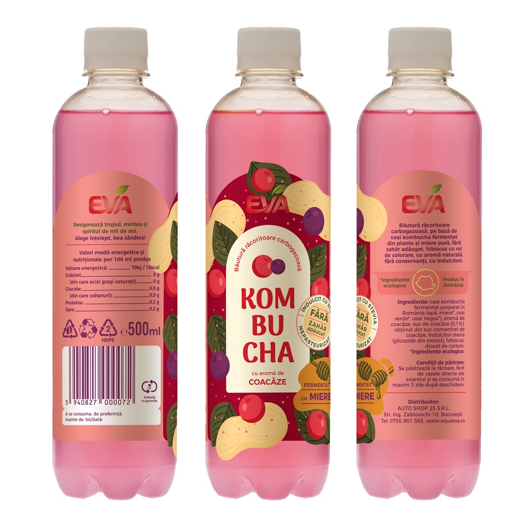Ingrediente:Ceai kombucha fermentat preparat in Romania (apa, miere*, ceai verde*, ceai negru*), aroma de coacaze,suc de coacaze (0.1%),obtinut din suc concentrat de coacaze, indulcitor stevia* (glicozide din steviol),hibiscus,dioxid de carbon *Ingrediente ecologice.