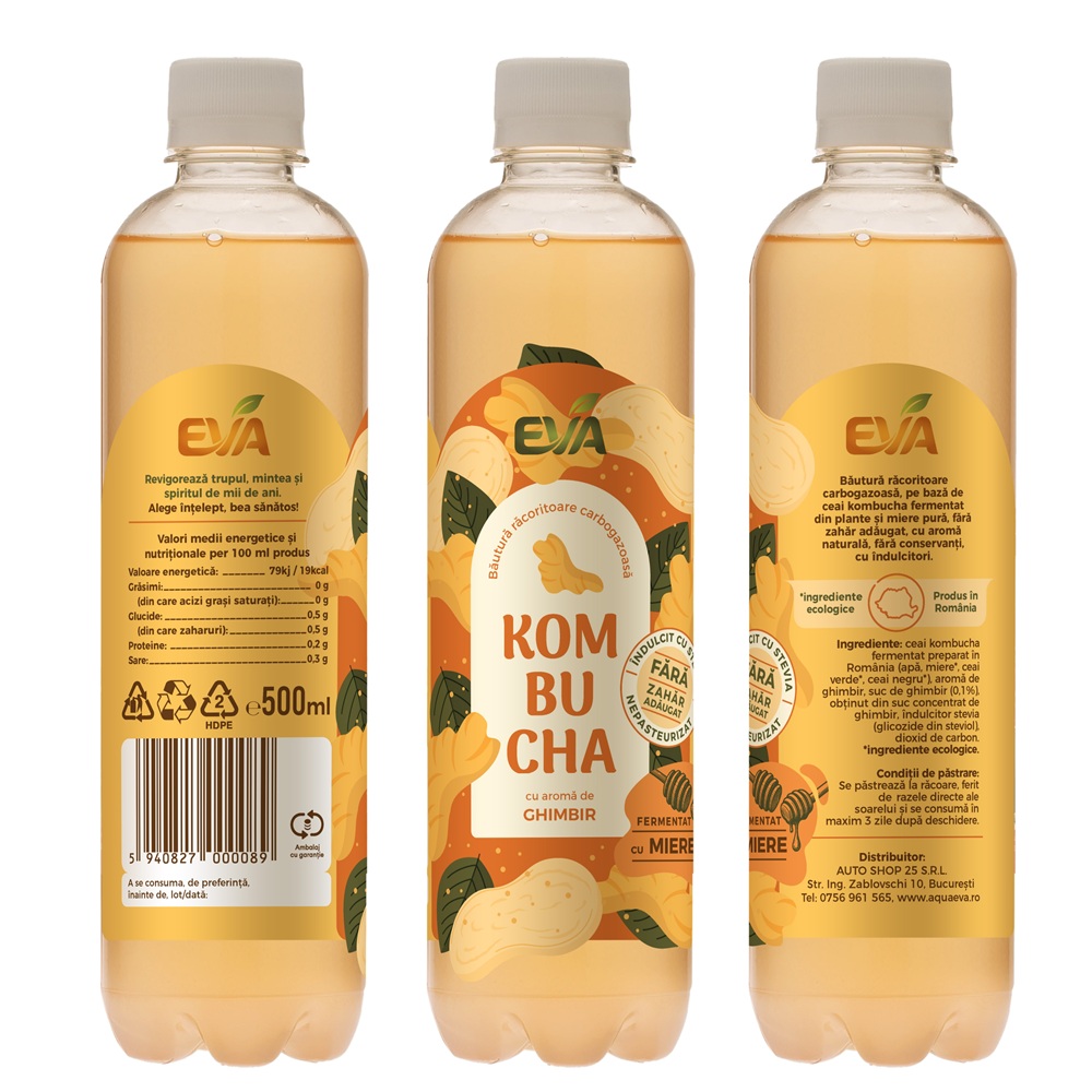 Ingrediente:Ceai kombucha fermentat preparat in Romania (apa, miere*, ceai verde*, ceai negru*), aroma de ghimbir,suc de ghimbir (0.1%),obtinut din suc concentrat de ghimbir, indulcitor stevia* (glicozide din steviol).dioxid de carbon *Ingrediente ecologice.