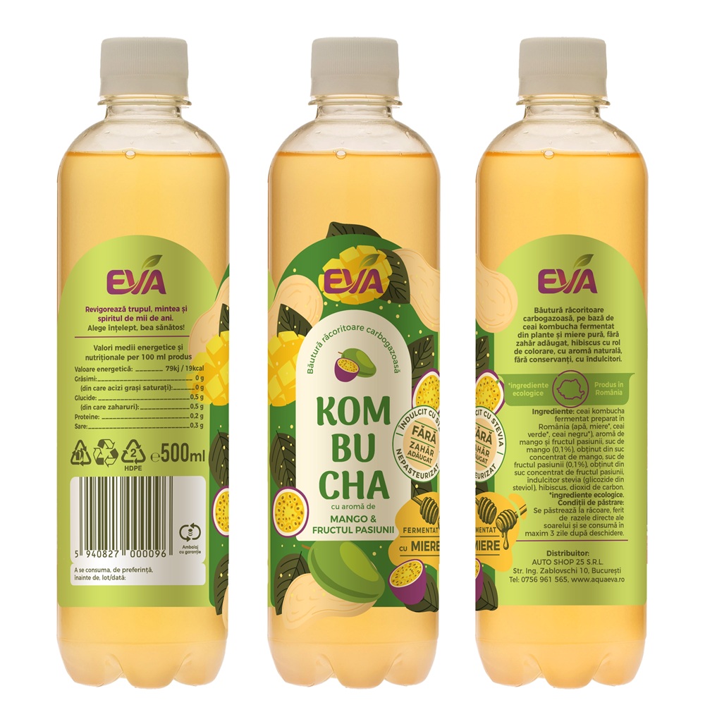 Ingrediente:Ceai kombucha fermentat preparat in Romania (apa, miere*, ceai verde*, ceai negru*), aroma de mango si fructul pasiunii,suc de mango (0.1%),obtinut din suc concentrat de mango,suc de fructul pasiunii ( 0,1%),obtinut din suc concentrat de fructul pasiunii, indulcitor stevia* (glicozide din steviol),hibiscus,dioxid de carbon. *Ingrediente ecologice.