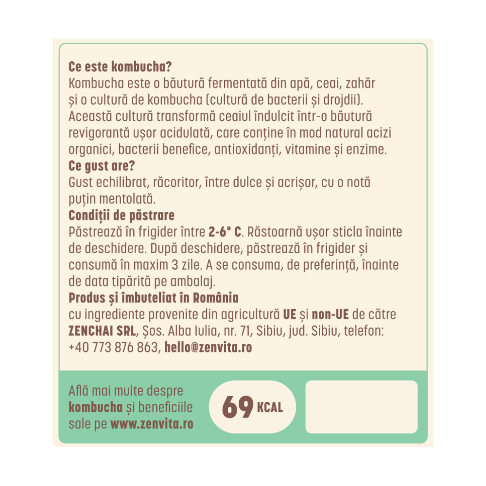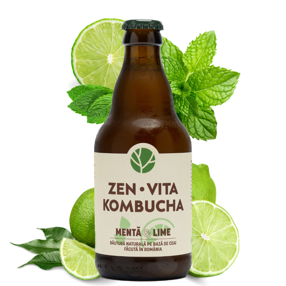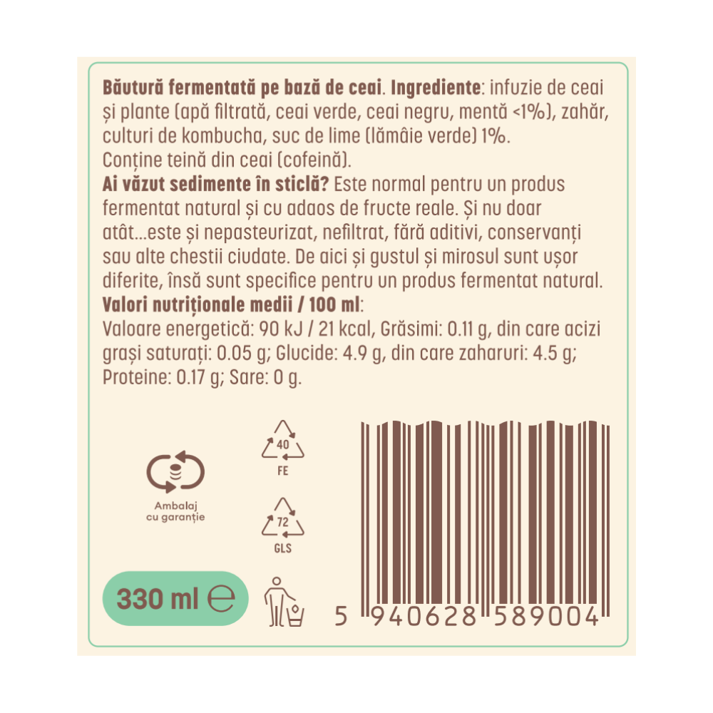 Infuzie de ceai si plante (apa filtrata, ceai verde, ceai negru, menta <1%), zahar, culturi de kombucha, suc de lime (lamaie verde) 1%.