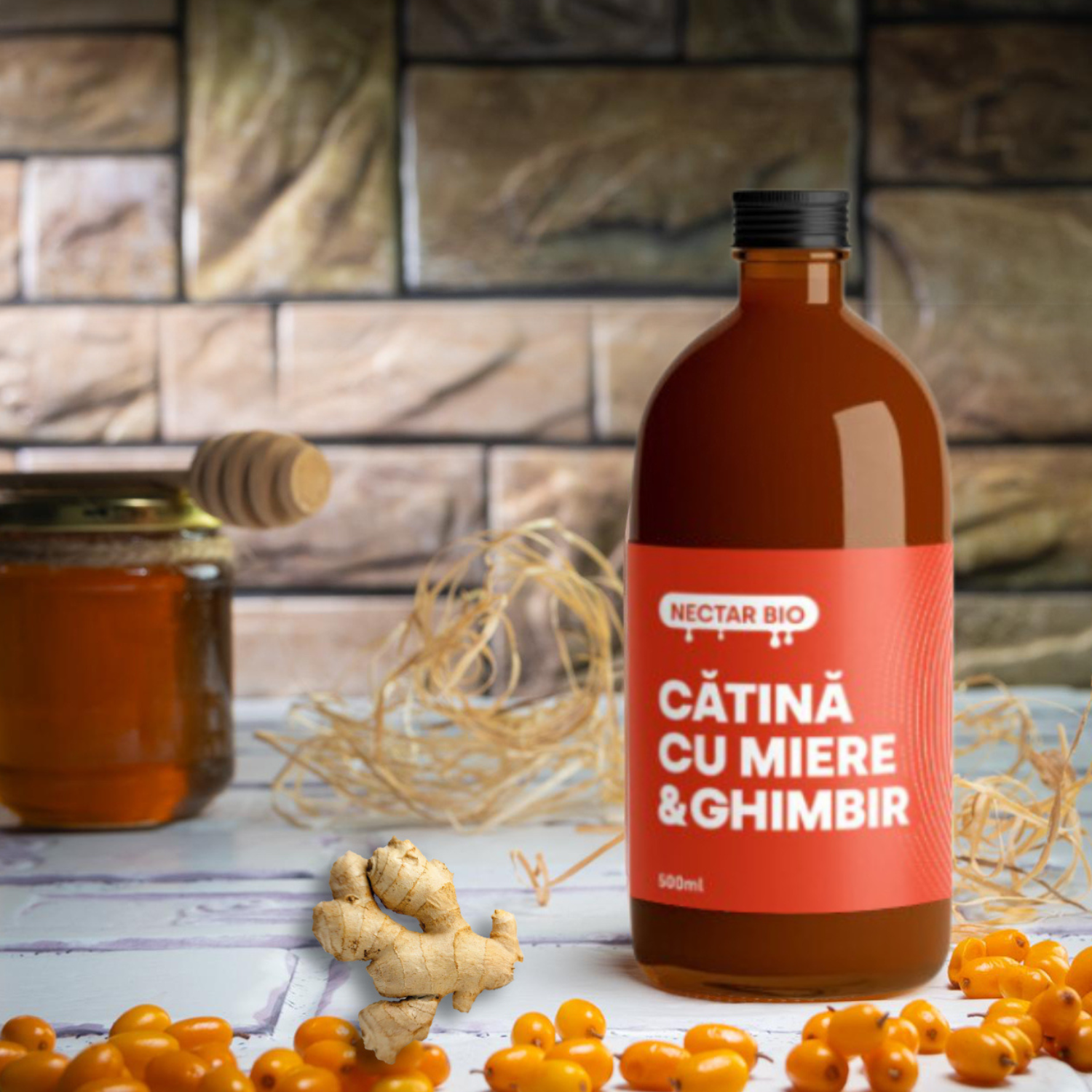 Ingrediente:apă, suc de cătină bio (presat la rece) și miere de albine bio și ghimbir ecologic proaspăt stors.
