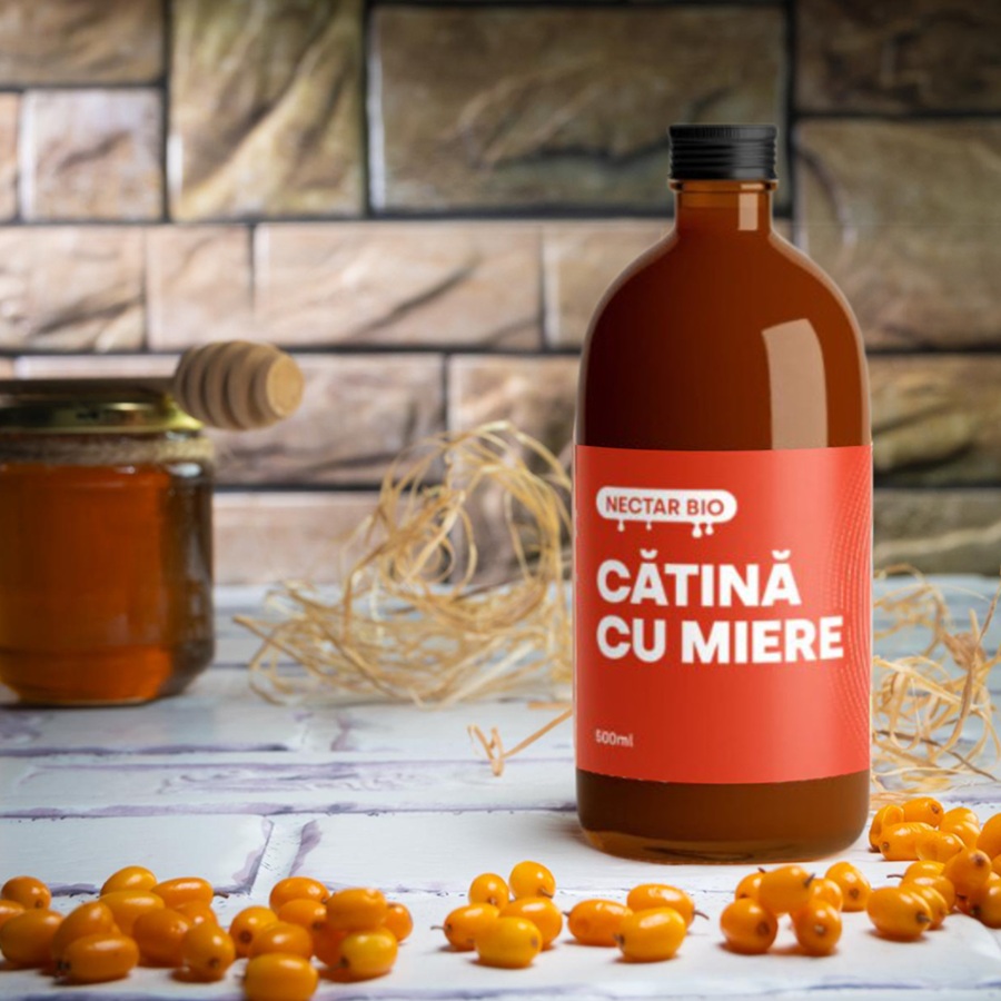 Ingrediente:apă, suc de cătină bio (presat la rece) și miere de albine bio.