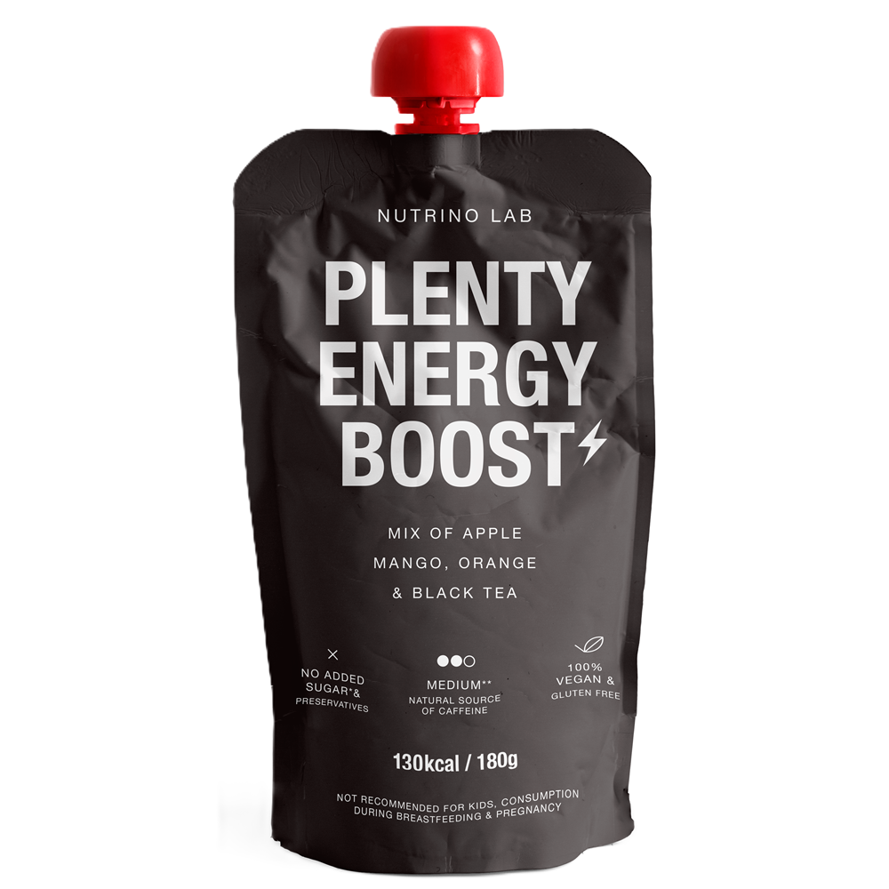 Piure pasteurizat din fructe cu mere, mango, portocale si ceai negru Plenty Energy Boost, 180 g, Nutrino Lab [8606019651367]