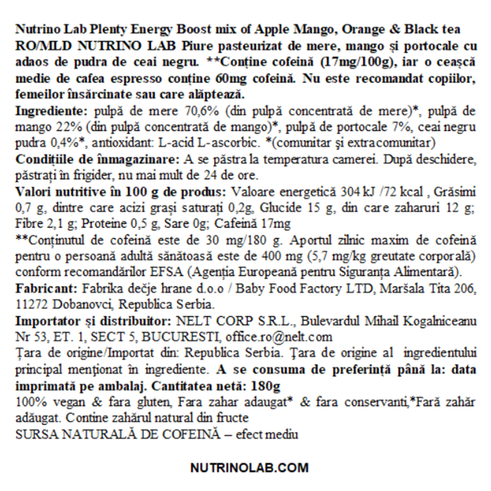 Piure pasteurizat din fructe cu mere, mango, portocale si ceai negru Plenty Energy Boost, 180 g, Nutrino Lab