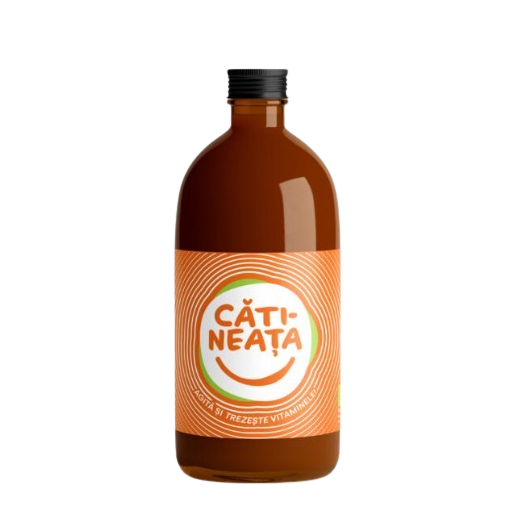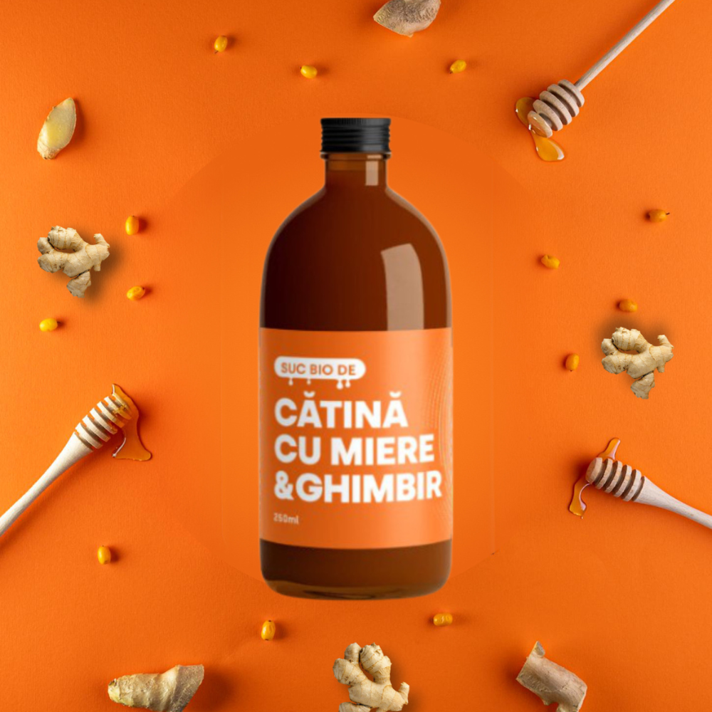 Ingrediente:apă, suc de cătină bio (presat la rece) și miere de albine bio și ghimbir ecologic proaspăt stors.
