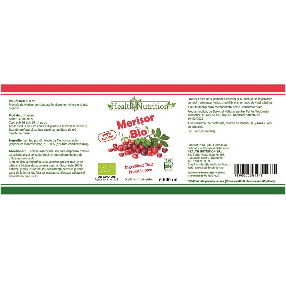 Suc pur din fructe de merișor canadian (Vaccinium macrocarpon) - 100% (*cultură certificată BIO).