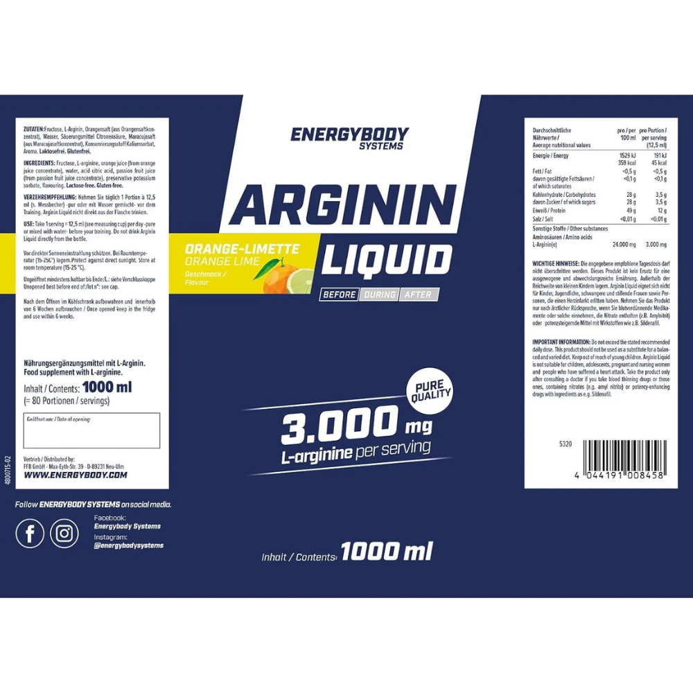 Ingrediente:Suc de portocale (din concentrat de suc de portocale), fructoza, L-arginina (19,4%), apa, acidifiant (acid citric), suc de fructul pasiunii (din concentrat de suc de fructul pasiunii), conservant (sorbat de potasiu), aroma.