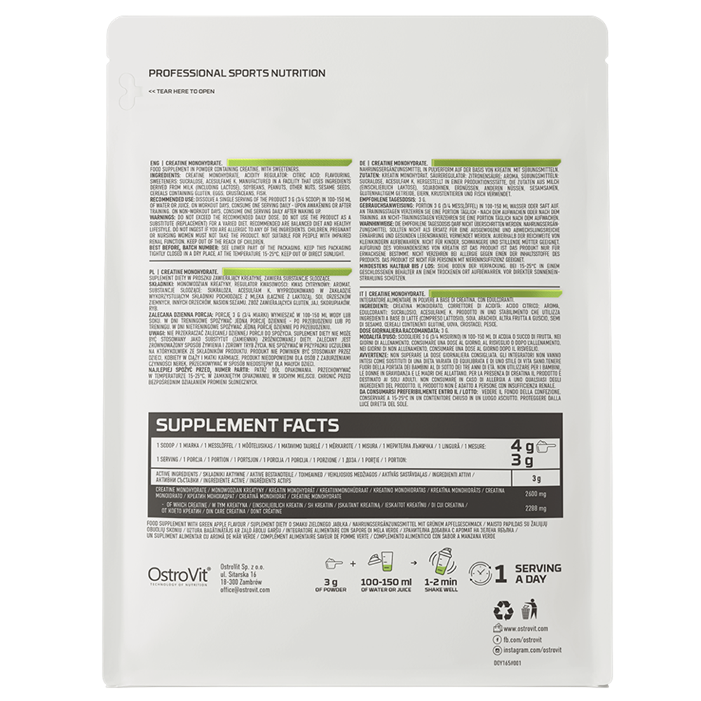 Monohidrat de creatina, Regulator de aciditate: acid citric, Aroma, Taurina, Indulcitori: sucraloza, acesulfam de potasiu, Clorhidrat de piridoxina/vitamina B6.
