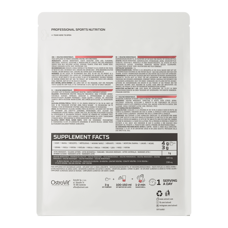 - 500 g creatină monohidrat per ambalaj (pentru varianta fără aroma;