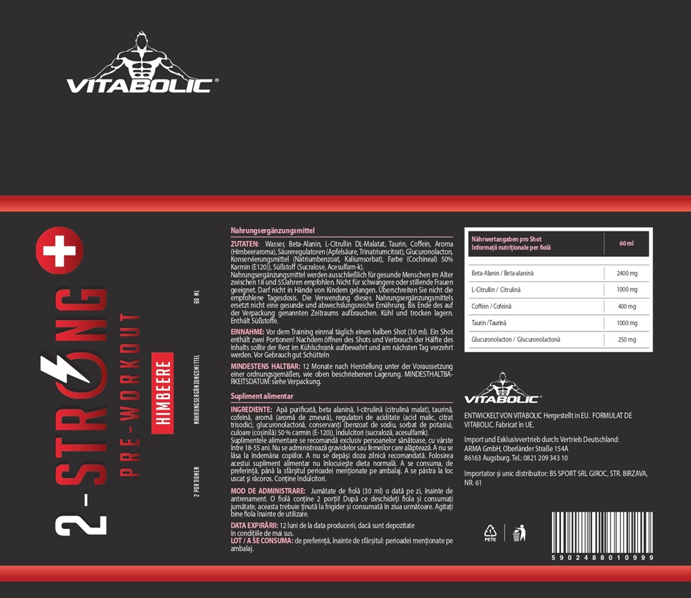 Apă purificată, beta alanină, l-citrulină (citrulină malat), taurină, cofeină, aromă (aromă de zmeură), regulatori de aciditate (acid malic, citrat trisodic), glucuronolactonă, conservanți (benzoat de sodiu, sorbat de potasiu), culoare (coșinilă) 50 % carmin (E-120)), îndulcitori (sucraloză, acesulfam-k).