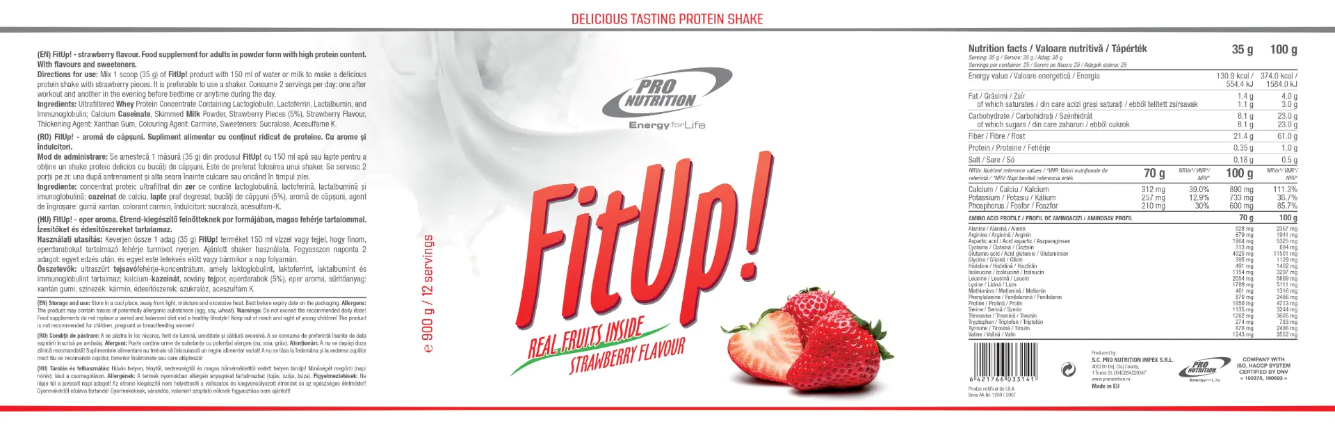 Ingrediente:Concentrat ultrafiltrat de proteină din zer ce conţine lactoglobulină, lactoferină, lactalbumină şi imunoglobulină, calciu cazeinat, lapte praf degresat, bucăţi de ciocolată (5%) (pentru aroma de ciocolată), bucăţi de zmeură (5%) (pentru aroma de zmeură), bucăţi de căpşuni (5%) (pentru aroma de căpşuni), cacao (pentru aroma de ciocolată), aromă, agent de îngroşare: gumă xantan (E415), colorant: carmin (pentru aroma de zmeură, aroma de căpşuni), îndulcitori: sucraloză (E955), acesulfam de potasiu (E950).