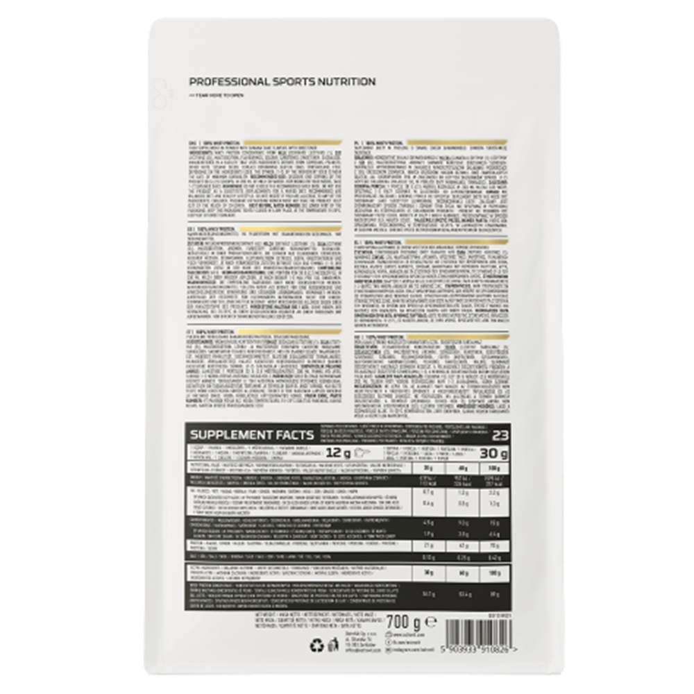 Concentrat de proteine din zer din lapte, contine lecitine, maltodextrina, arome, colorant: caroteni, indulcitor: sucraloza.