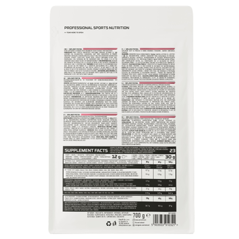Concentrat de proteine din zer din lapte, contine lecitine, maltodextrina, arome, colorant: concentrat de suc de sfecla in pulbere, indulcitor: sucraloza.