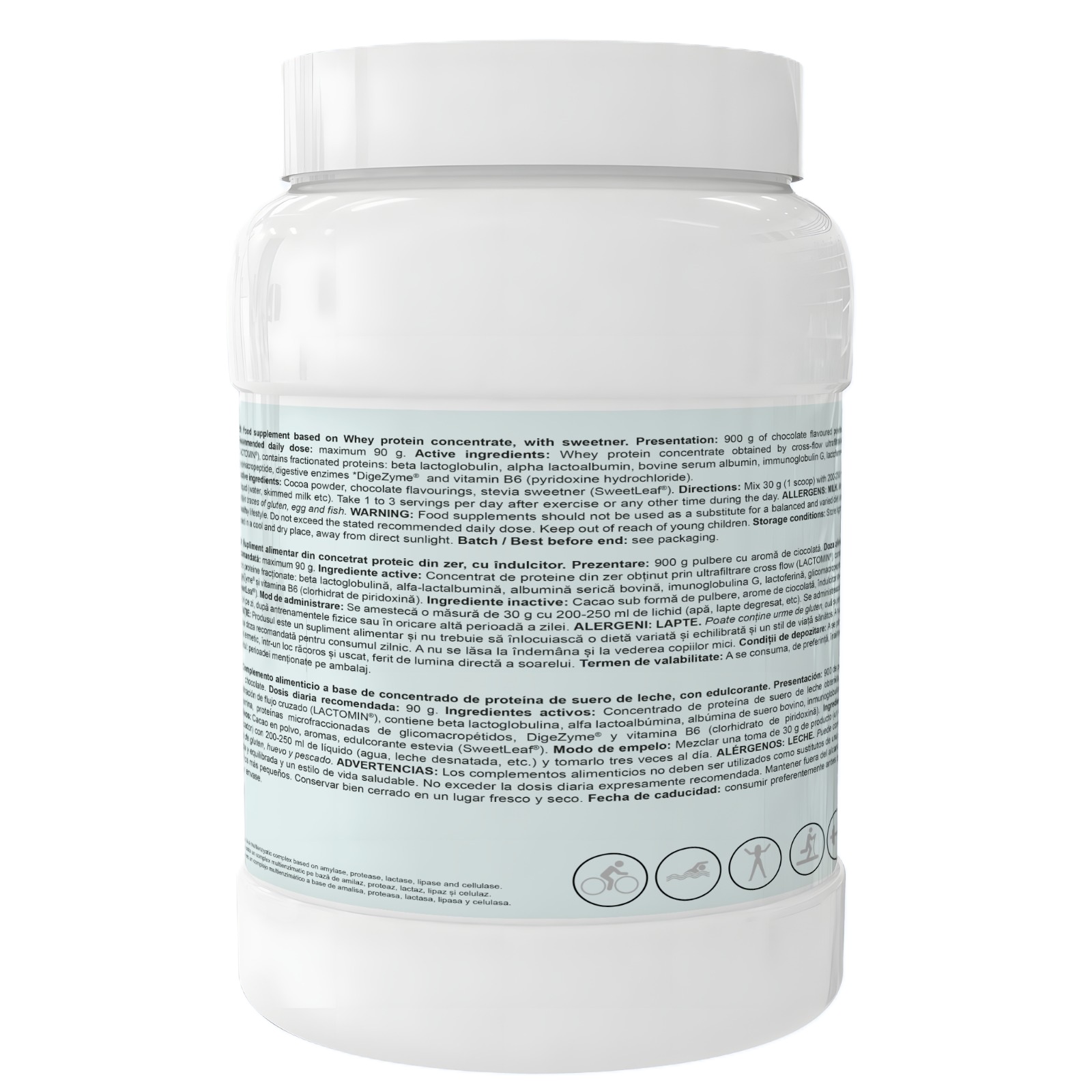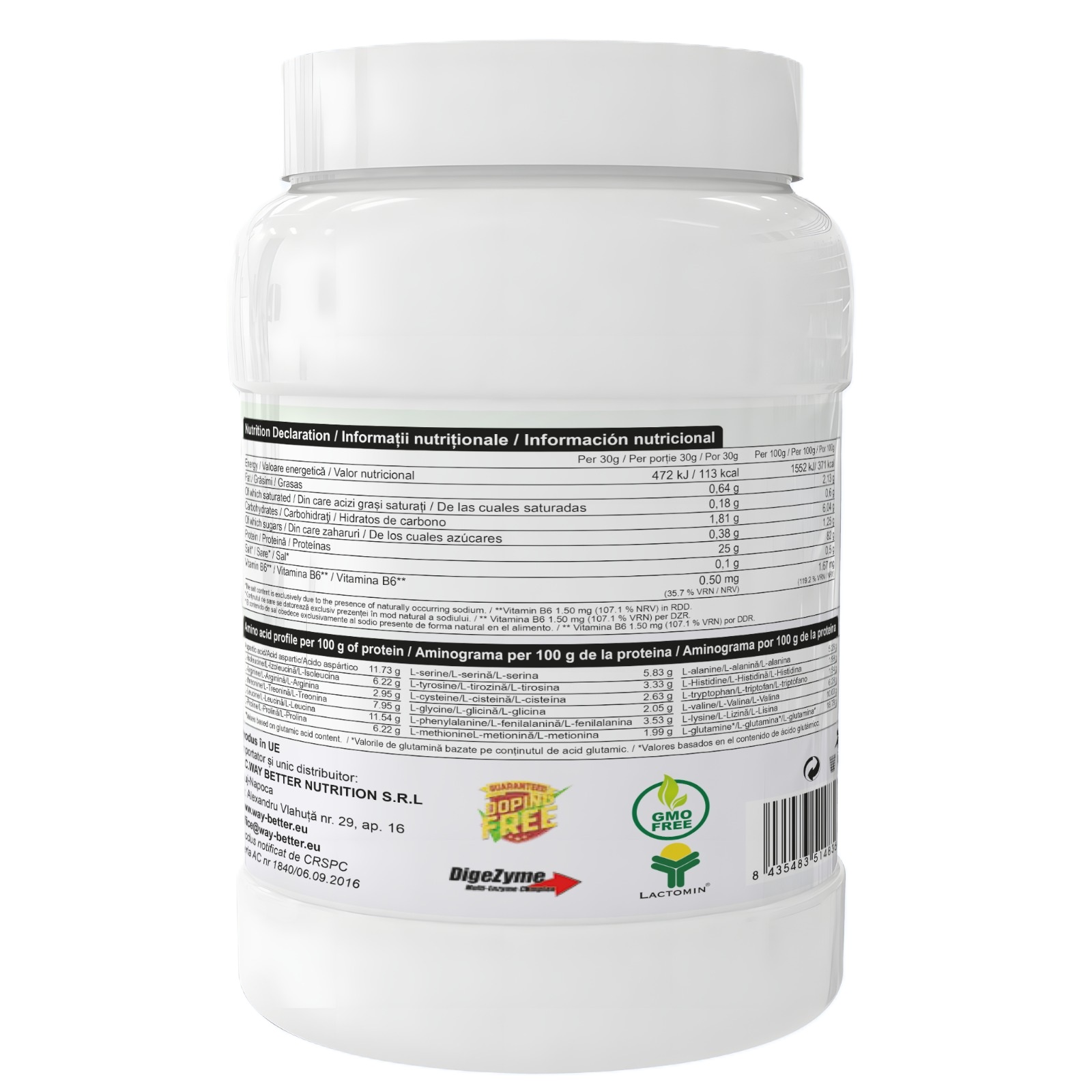 - produsul contine 82% proteina din sursa LACTOPROT, care imbina proprietati functionale si nutritionale deosebite;