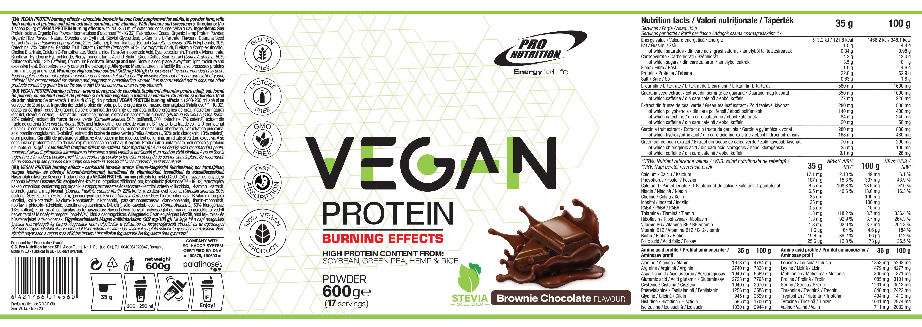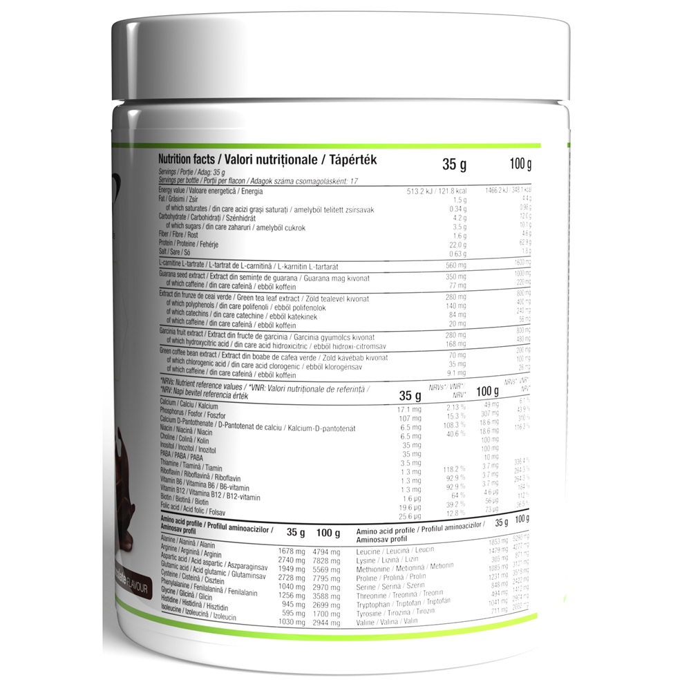 Izolat proteic din soia, pulbere organica de mazare, isomaltuloza (Palatinose™ - IG 32), cacao cu continut redus de grasimi, pulbere organica din seminte de canepa, pulbere organica de orez, indulcitori naturali (eritritol, steviol glicozide), L-tartrat de L-carnitina, arome, extract din seminte de guarana (Guarana Paullinia cupana Kunth, 22% cafeina), extract din frunze de ceai verde (Camellia sinensis, 50% polifenoli, 30% catechine, 7% cafeina), extract din fructe de garcinia (Garcinia Cambogia, 60% acid hidroxicitric), complex de vitamine B (inozitol, bitartrat de colina, D-pantotenat de calciu, nicotinamida, acid para aminobenzoic, ciancobalamina, mononitrat de tiamina, riboflavina, clorhidrat de piridoxina, acid pteroilmonoglutamic, D-biotina), extract din boabe de cafea verde (Coffea Arabica L., 50% acid clorogenic, 13% cafeina), crom picolinat.