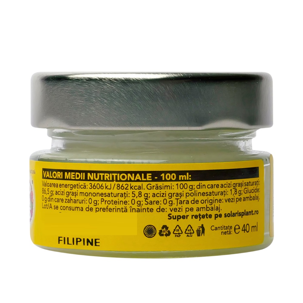 Uleiul de cocos este bogat in grasimi saturate. Poate avea forma solida sau lichida, in functie de temperatura mediului ambient.
