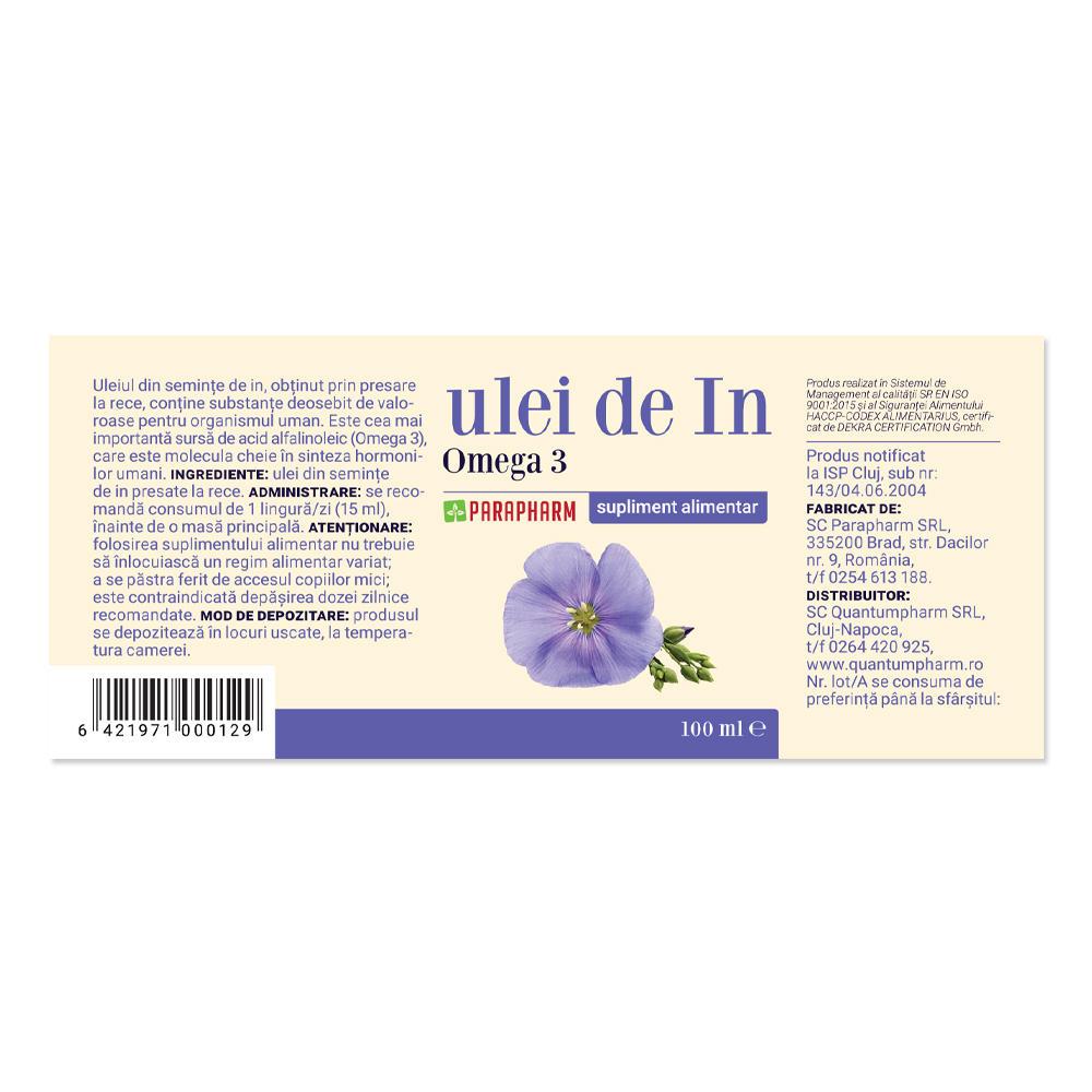 - semintele de in sunt o sursa bogata de acizi grasi esentiali: omega-3 (acid alfa linoleic) si omega-6 (acid linoleic);