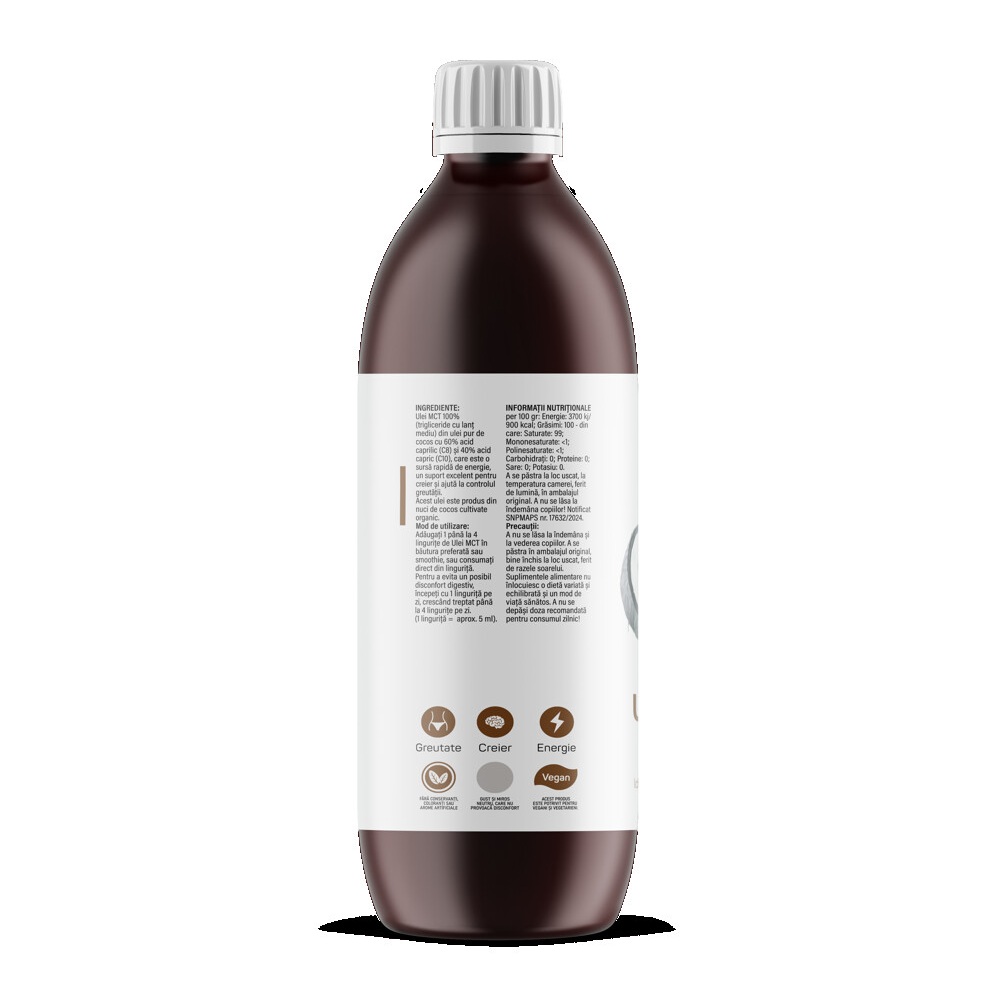 Ulei MCT 100% (trigliceride cu lant mediu) din ulei pur de cocos cu 60% acid caprilic (C8) si 40% acid capric (C10). Produs din nuci de cocos cultivate organic.