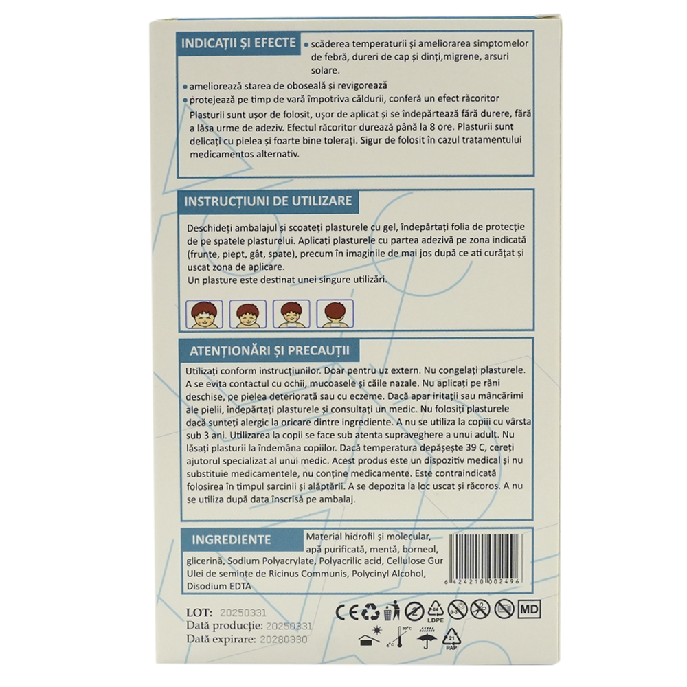 Deschideti ambalajul si scoateti plasturele cu gel, indepartati folia de protectie de pe spatele plasturelui.