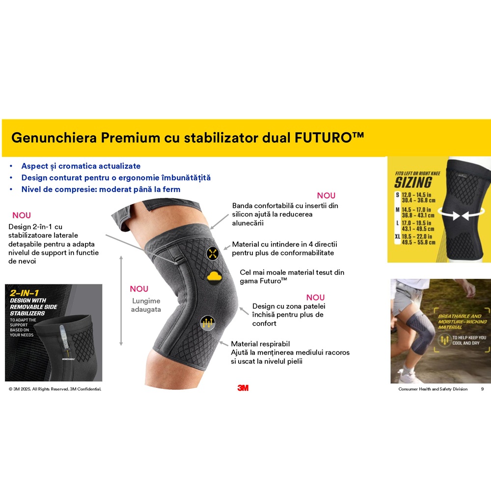 - circumferinta genunchiului 36.8-43.1 cm, pentru alegerea masurii potrivite, masurati in jurul rotulei in pozitie in picioare.