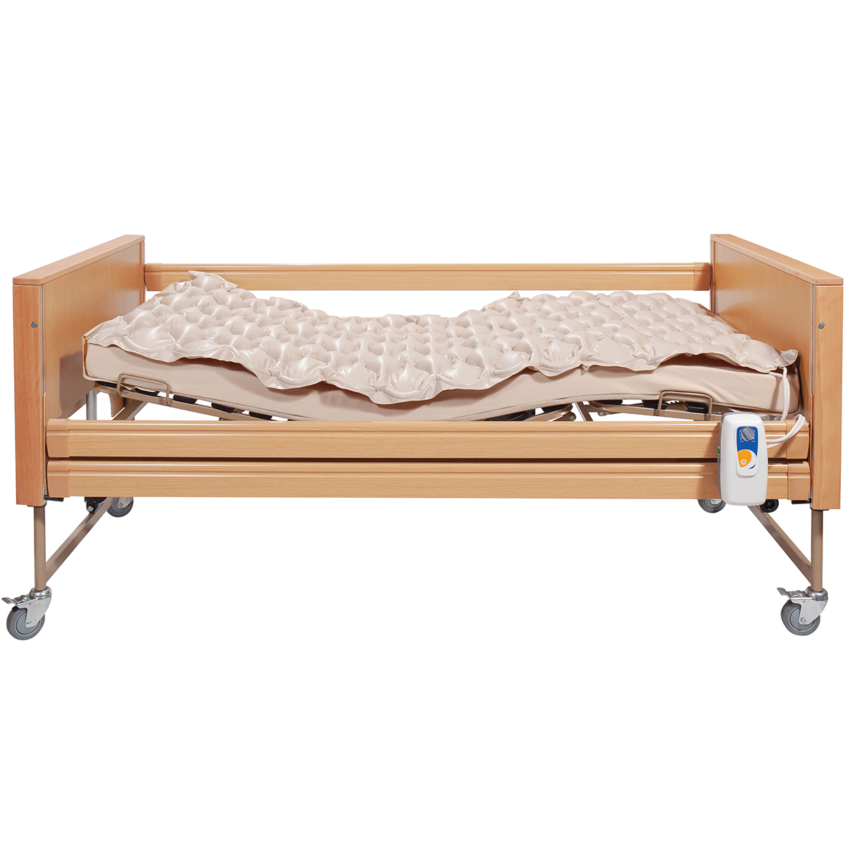 - Conectați salteaua la pompă cu ajutorul furtunurilor corespunzătoare pe care le găsiți în ambalaj. Înainte să utilizați salteaua la un pacient, conectați pompa la sursa de alimentare, apăsați comutatorul ”ON/OFF” și rotiți butonul la maxim pentru a umfla salteaua.