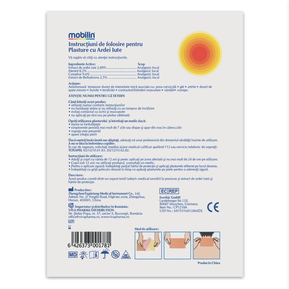 - acest produs consta dintr-un suport textil (adeziv medical sensibil la presiune si extract de ardei iute) si hartie de protectie;