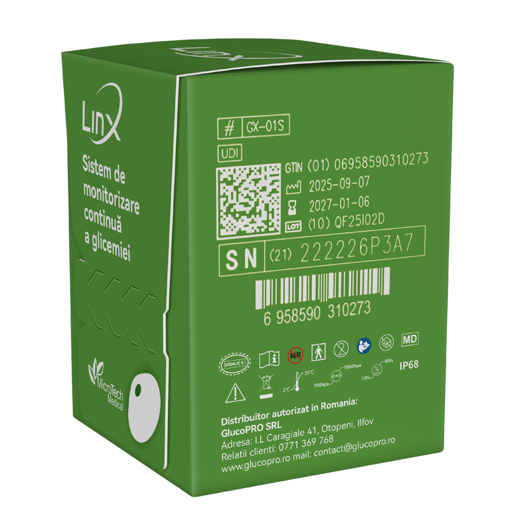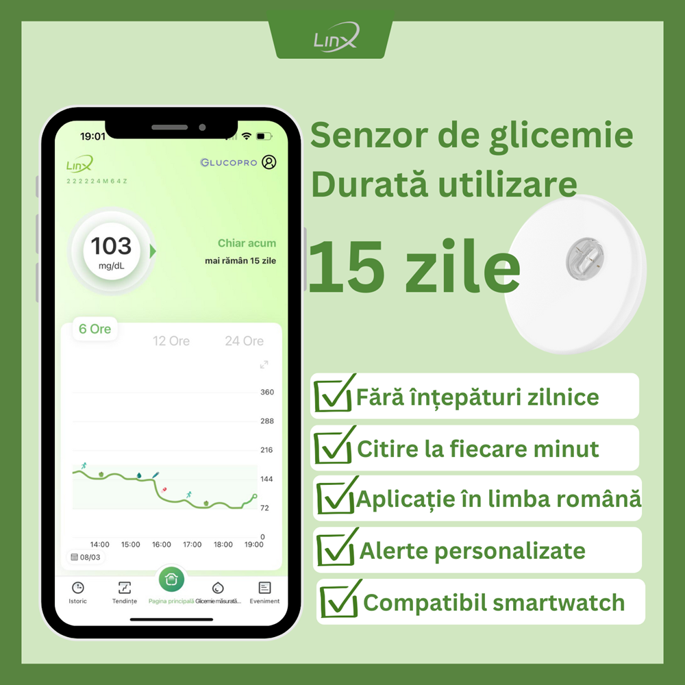 - senzorul subcutanat masoara glucoza din lichidul interstitial si transmite date prin Bluetooth catre aplicatia LinX;