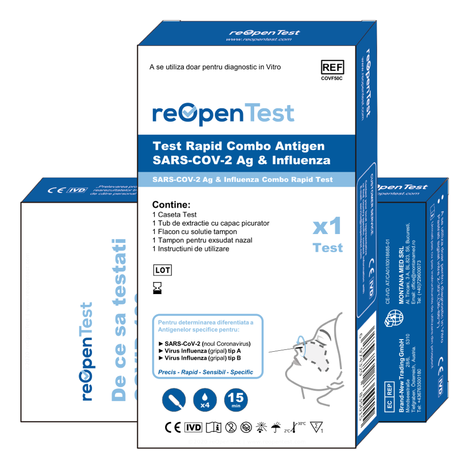 Influenza este destinat utilizării ca ajutor în diagnosticarea infecției cu SARS-CoV-2 și/sau a gripei cu virus Influenza tip A sau tip B. Produsul poate fi utilizat în orice mediu de laborator și conditii de ambulator care îndeplinește cerințele specificate în instrucțiunile de utilizare și reglementările locale. Testul oferă rezultate preliminare. Rezultatele negative trebuie combinate cu observațiile clinice, istoricul pacientului și informațiile epidemiologice. Testul nu este destinat utilizării ca test de
