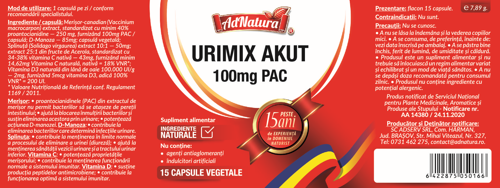 Ingrediente:Per capsulă: Merisor-canadian (Vaccinium macrocarpon) extract, standardizat cu minim 40% proantocianidine - 250 mg, furnizând 100mg PAC/ capsulă; D-Manoza - 85mg; capsulă vegetală; Splinuță (Solidago virgaurea) extract 10:1 - 50mg; extract 25:1 din fructe de Acerola, standardizat cu 34-38% vitamina C nativă - 43mg, furnizând minim 14,62mg Vitamina C naturală, nativă - 18% VNR"; Vitamina D3 naturală din lână de oaie 100.000 UI/g - 2mg, furnizând 5mcg vitamina D3, adică 100% VNR* = 200 UI.