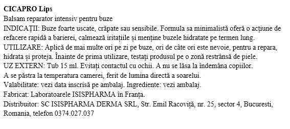 - Cicapro Lips este un balsam reparator intensiv pentru buze, formulat cu o selectie concentrata de ingrediente emoliente si protectoare, ideal pentru buze foarte uscate, crapate sau sensibile;
