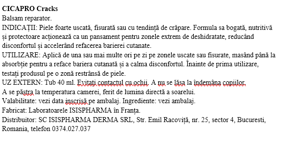 - Cicapro Cracks este un balsam reparator intens, creat pentru pielea foarte uscata, fisurata sau cu tendinta de crapare;