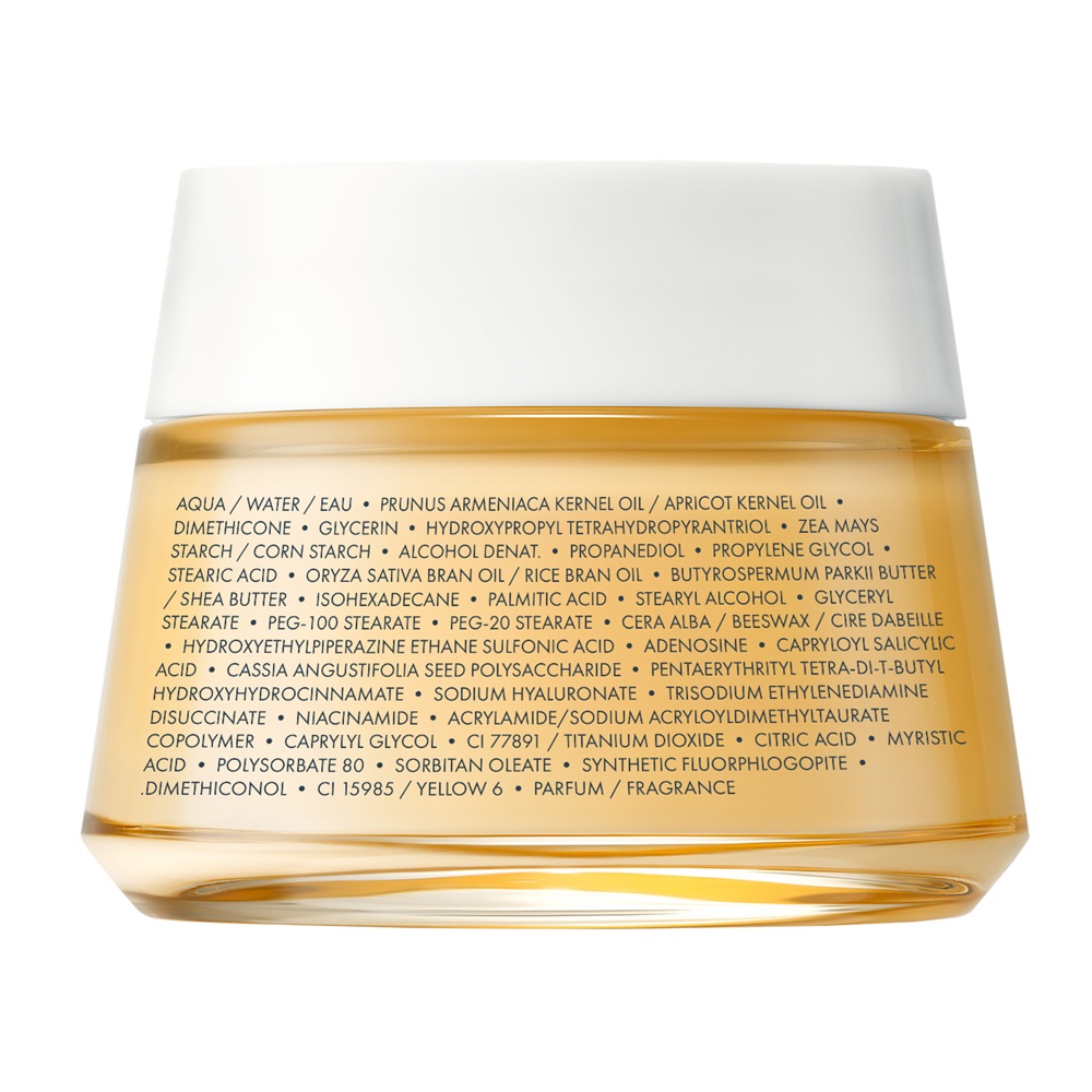 Ingrediente:Aqua / Water / Eau, Prunus Armeniaca Kernel Oil / Apricot Kernel Oil, Dimethicone, Glycerin, Hydroxypropyl Tetrahydropyrantriol, Zea Mays Starch / Corn Starch, Alcohol Denat., Propanediol, Propylene Glycol, Stearic Acid, Oryza Sativa Bran Oil / Rice Bran Oil, Butyrospermum Parkii Butter / Shea Butter, Isohexadecane, Palmitic Acid, Stearyl Alcohol, Glyceryl Stearate, PEG-100 Stearate, PEG-20 Stearate, Cera Alba / Beeswax / Cire d’Abeille, Hydroxyethylpiperazine Ethane Sulfonic Acid, Adenosine, Capryloyl Salicylic Acid, Cassia Angustifolia Seed Polysaccharide, Pentaerythrityl Tetra-di-t-butyl Hydroxyhydrocinnamate, Sodium Hyaluronate, Trisodium Ethylenediamine Disuccinate, Niacinamide, Acrylamide / Sodium Acryloyldimethyltaurate Copolymer, Caprylyl Glycol, CI 77891 / Titanium Dioxide, Citric Acid, Myristic Acid, Polysorbate 80, Sorbitan Oleate, Synthetic Fluorphlogopite, Dimethiconol, CI 15985 / Yellow 6, Parfum / Fragrance.