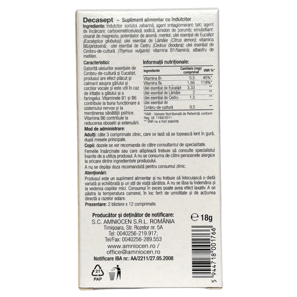 îndulcitori: sorbitol, zaharina; agent antiaglomerant: talc; agent de incarcare: carboximetilceluloza sodica, amidon de porumb; emulsifiant : steararat de magneziu; potentiator de aroma : mentol ; ulei esenţial de Eucalipt (Eucalyptus globulus); ulei esential de Lamaie (Citrus lemon); ulei essential de cedru (Cedrus deodara); ulei essential de Cimbru de cultura (Thymus vulgaris); vitamin B6(piridoxina); vitamin B1(tiamina); albastru de metilen.