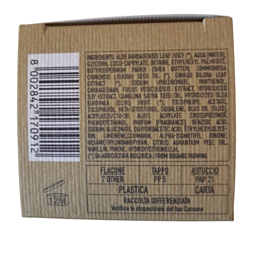 Ingrediente:Aloe barbadensis leaf juice (*), Aqua [Water], Glycerin, Coco-caprylate, Betaine, Ethylhexyl palmitate, Butyrospermum parkii (Shea butter), Simmondsia chinensis (Jojoba) seed oil (*), Ginkgo biloba leaf extract (*), Sodium hyaluronate, Panthenol, Carrageenan, Fucus vesiculosus extract, Hydrolyzed soy extract, Camelina sativa seed oil, Hydrolyzed olea europaea (olive) fruit (*), Tocopheryl acetate, Tocopherol, Beta-sitosterol, Squalene, Olus oil [Olus], Acrylates/C10-30 alkyl acrylate crosspolymer, Phenoxyethanol, Parfum [Fragrance], Benzoic acid, Sodium gluconate, Dehydroacetic acid, Ethylhexylglycerin, Limonene,Coumarin, Alpha-isomethyl ionone, Hexamethylindanopyran, Citrus aurantium peel oil, Vanillin, Pinene, Hydroxycitronellal.