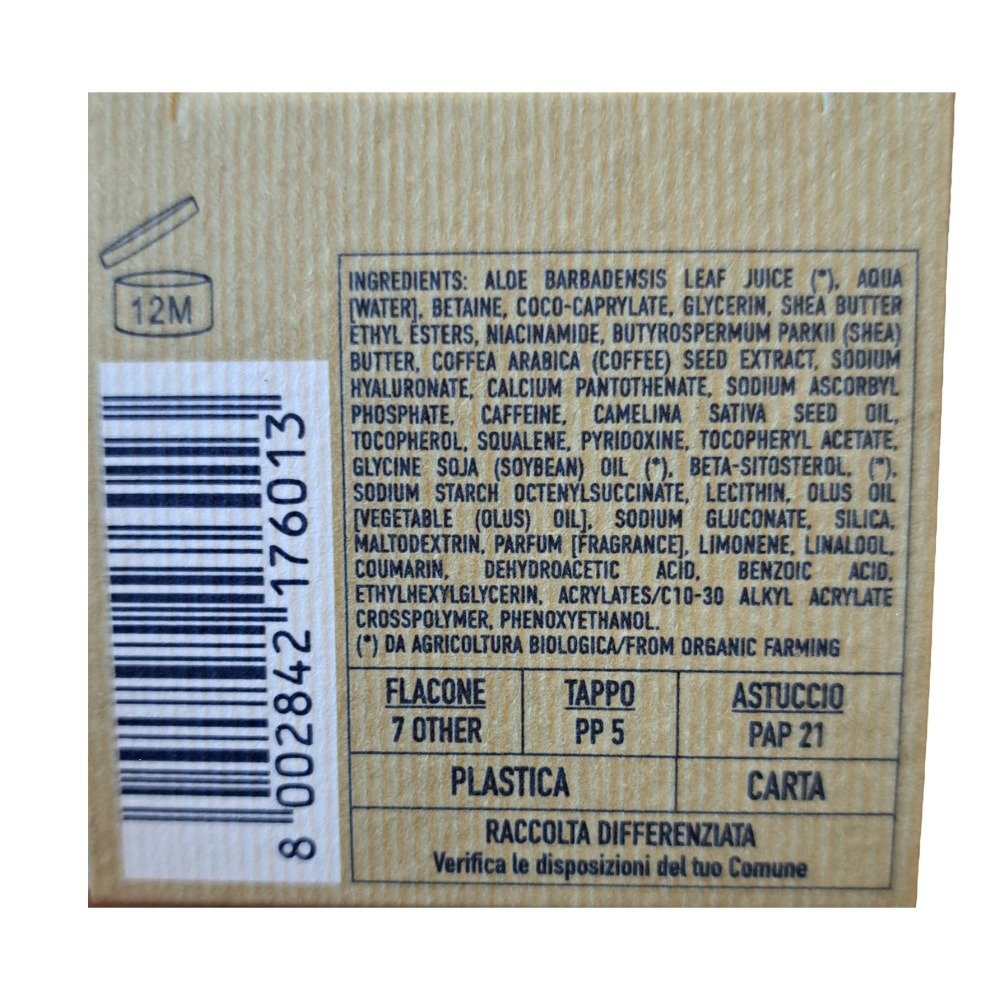 Ingrediente:Aloe barbadensis leaf juice (*), Aqua [Water], Betaine, Coco-caprylate, Glycerin, Shea butter ethyl esters, Niacinamide, Butyrospermum parkii (Shea) butter, Coffea arabica (Coffee) seed extract, Sodium hyaluronate, Calcium pantothenate, Sodium ascorbyl phosphate, Caffeine, Camelina sativa seed oil, Tocopherol, Squalene, Pyridoxine, Tocopheryl acetate, Glycine soja (Soybean) oil (*), Beta-sitosterol, Sodium starch octenylsuccinate, Lecithin, Olus oil [Vegetable (Olus) oil], Sodium gluconate, Silica, Maltodextrin, Parfum [Fragrance], Limonene, Linalool, Coumarin, Tetramethyl acetyloctahydronaphthalenes, Hexamethylindanopyran, Pogostemon cablin oil, Linalyl acetate, Citrus limon peel oil [Citrus medica limonum (Lemon) peel oil], Pinene, Dehydroacetic acid, Benzoic acid, Ethylhexylglycerin, Acrylates/C10-30 alkyl acrylate crosspolymer, Phenoxyethanol.