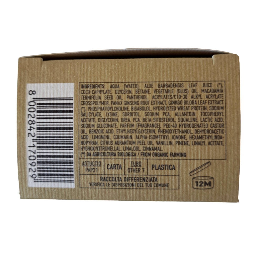 Ingrediente:Aqua [Water], Aloe barbadensis leaf juice (*), Coco-caprylate, Glycerin, Betaine, Vegetable (Olus) oil, Macadamia ternifolia seed oil, Panthenol, Acrylates/C10-30 alkyl acrylate crosspolymer, Panax ginseng root extract, Ginkgo biloba leaf extract (*), Phosphatidylcholine, Bisabolol, Hydrolyzed wheat protein, Sodium salicylate, Lysine, Sorbitol, Sodium PCA, Allantoin, Tocopheryl acetate, Diglycerin, Urea, PCA, Beta-sitosterol, Squalene, Lactic acid, Sodium gluconate, Parfum [Fragrance], PEG-40 hydrogenated castor oil, Benzoic acid, Ethylhexylglycerin, Phenoxyethanol, Dehydroacetic acid, Limonene, Coumarin, Alpha-isomethyl ionone, Hexamethylindanopyran, Citrus aurantium peel oil, Vanillin, Pinene, Linalyl acetate, Hydroxycitronellal, Linalool, Cinnamal.