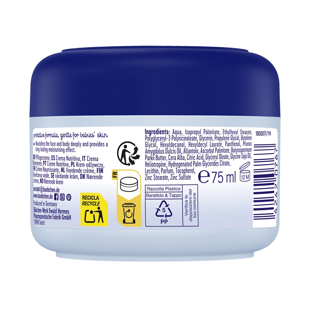 Aqua, Isopropyl Palmitate, Ethylhexyl Sterate, Polyglyceryl-3, Polyricinoleate, Glycerin, , Polyricinoleate Glycerin, Propylene Glycol, Butylene Glycol, Hexyldecanol, Hexyldecyl Laurate, Pantehnol, Prunus Amygdalus Dulcis Oil, Allatoin, Ascorbyl Palmitate, Butyrospermum Parkii Butter, Cera Alba, Citric Acid, Glyceryl Oleate, Glycine Soja Oil, Helitropine, Hydrogenated Palm Glycerides Citrate, Lecithin, Parfum, Tocopherol, Zinc Sterate, Zinc Sulfate.