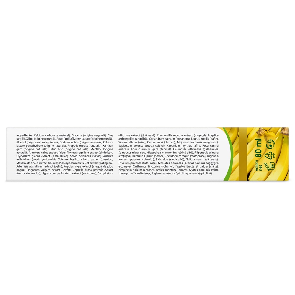 Calcium carbonate, Glycerin (vegetala), Clay (argila), Apa (aqua), Glyceryl laurate(natural), Aroma Alcohol (natural), Calcium Lactate Pentahydrate (origine naturala),Sodium lactate (origine naturala), Propolis extract, Xanthan gum (origine naturala), Citric acid, Menthol (origine naturala), Aloe vera callus extract (aloe),Thymus serpyllum extract(cimbrisor), Glycyrrhiza glabra extract (lemn dulce), Salvia officinalis(salvie), Achillea millefolium (coada soricelului), Ocimum basilicum herb extract(busuioc), Melissa officinalis extract(roinita), Plantago lanceolata leaf extract (patlagina), Artemisia absinthium extract (pelin), Populus nigra extract (muguri de plop negru), Origanum vulgare extract(sovarf), Capsella bursa pastoris extract (traista ciobanului), Hypericum perforatum extract (sunatoare), Symphytum officinale extract (tataneasa), Chamomilla recutita extract(musetel), Angelica archangelica (angelica), Coriandrum sativum (coriandru), Laurus nobilis (dafin), Viscum album (vasc), Carum carvi (chimen), Majorana hortensis (magheran), Equisetum arvense (coada calului), Vaccinium myrtillus (afin), Rosa canina (maces), Foeniculum vulgare(fenicul), Calendula officinalis(galbenele), Sambucus nigra(soc), Hippophae rhamnoides(catina alba), Filipendula ulmaria(cretusca), Humulus lupulus(hamei), Chelidonium majus(rostopasca), Trigonela foenum graecum(schinduf), Salix alba(salcia alba), Galium verum(sanziene), Trifolium pratense(trifoi roșu), Melilotus officinalis(sulfina), Cotinus coggygria(scumpie), Carthamus tinctorius(sofranel), Tagetes Erebta et patula(craite), Pimpinella anisum(anason), Arnica montana(arnica), Myrtus communis(mirt), Hyssopus officinalis (isop), Juglans regia(nuc).