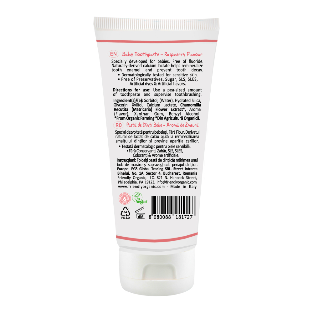 Pastă de dinți pentru copii cu aromă de zmeură, ce ajută la prevenirea apariției cariei dentare.