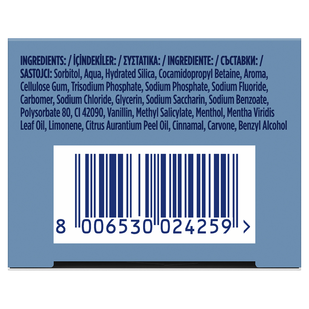 Ingrediente:Sorbitol, Aqua, Hydrated Silica, Cocamidopropyl Betaine, Aroma, Cellulose Gum, Trisodium Phosphate, Sodium Phosphate, Sodium Fluoride, Carbomer, Sodium Chloride, Glycerin, Sodium Saccharin, Sodium Benzoate, Polysorbate 80, CI 42090, Vanillin, Methyl Salicylate, Menthol, Mentha Viridis Leaf Oil, Limonene, Citrus Aurantium Peel Oil, Cinnamal, Carvone, Benzyl Alcohol. Conţine fluorură de sodiu (1000 ppm fluorură).