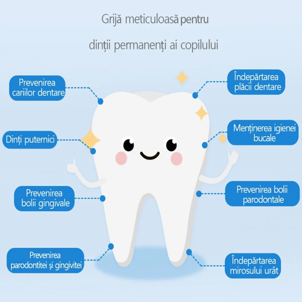 - creata pentru a proteja dintii copiilor impotriva cariilor si pentru a mentine o igiena orala optima;