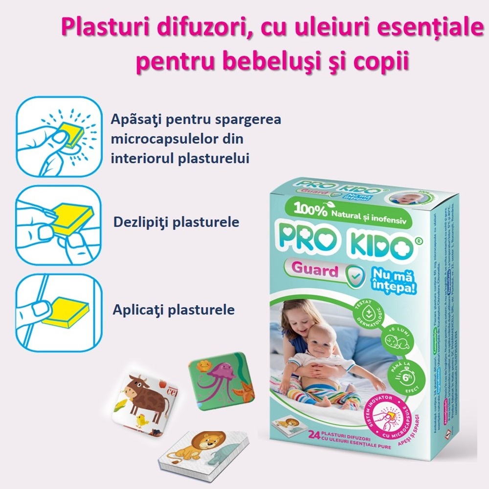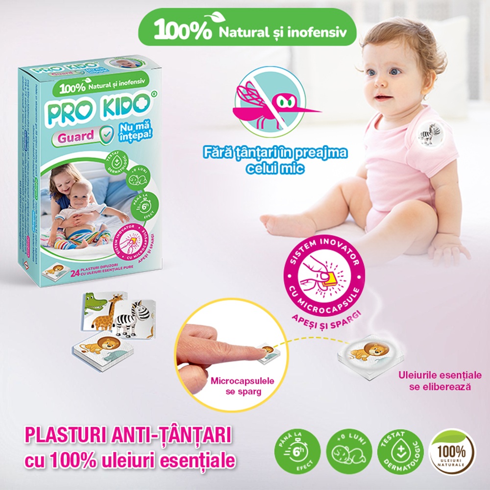 - Plasturii Pro Kido Guard Nu ma intepa beneficiaza de tehnologie unică în România - Sistem inovator cu microcapsule cu uleiuri esentiale 100% pure, concentrate, ce garanteaza eficienta ridicata de pana la 6 ore, fara risc de alergii sau iritatii.