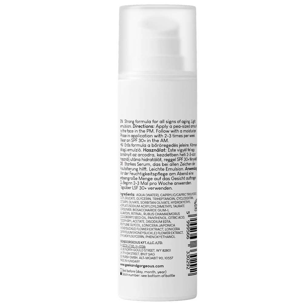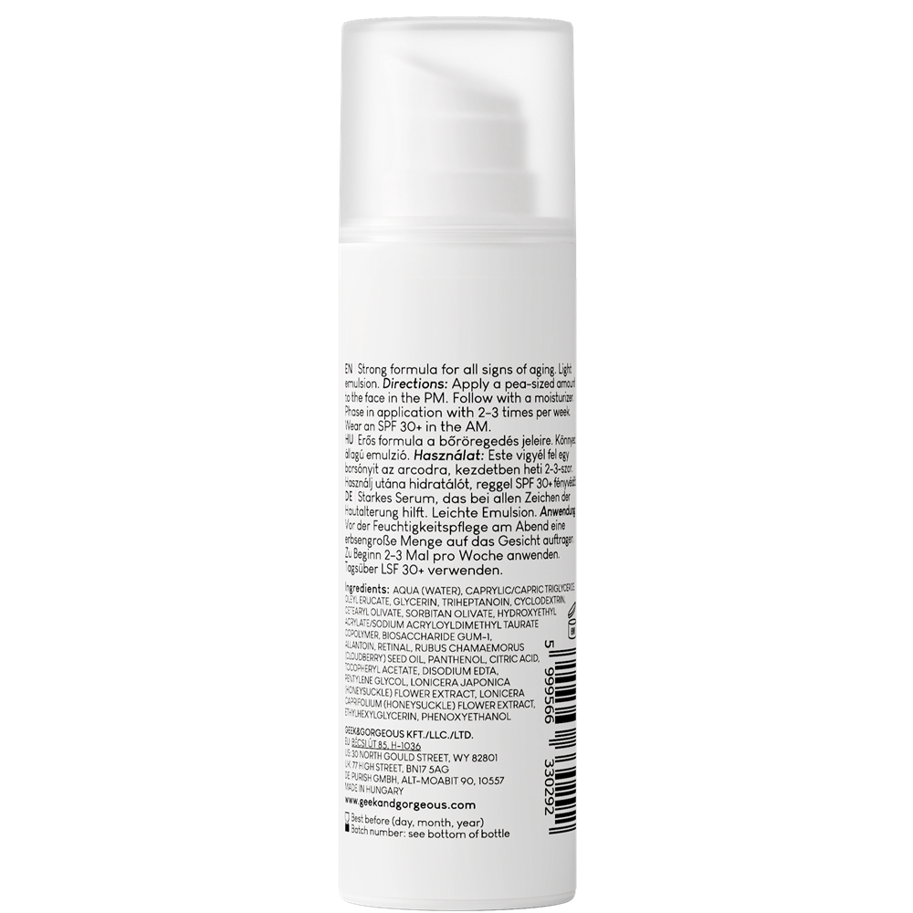 Aqua (Water), Caprylic/Capric Triglyceride, Oleyl Erucate, Glycerin, Triheptanoin, Cyclodextrin, Cetearyl Olivate, Sorbitan Olivate, Hydroxyethyl Acrylate/Sodium Acryloyldimethyl Taurate Copolymer, Biosaccharide Gum-1, Allantoin, Retinal, Rubus Chamaemorus (Cloudberry) Seed Oil, Panthenol, Citric Acid, Tocopheryl Acetate, Disodium EDTA, Pentylene Glycol, Ethylhexylglycerin, Phenoxyethanol.