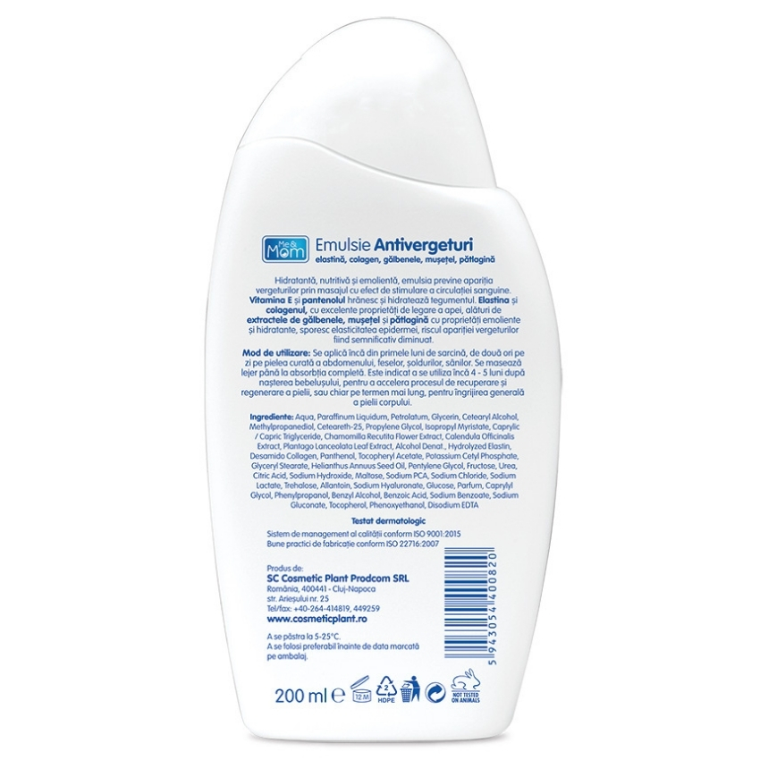 - hidratanta, nutritiva si emolienta, emulsia previne aparitia vergeturilor prin masajul cu efect de stimulare a circulatiei sanguine;