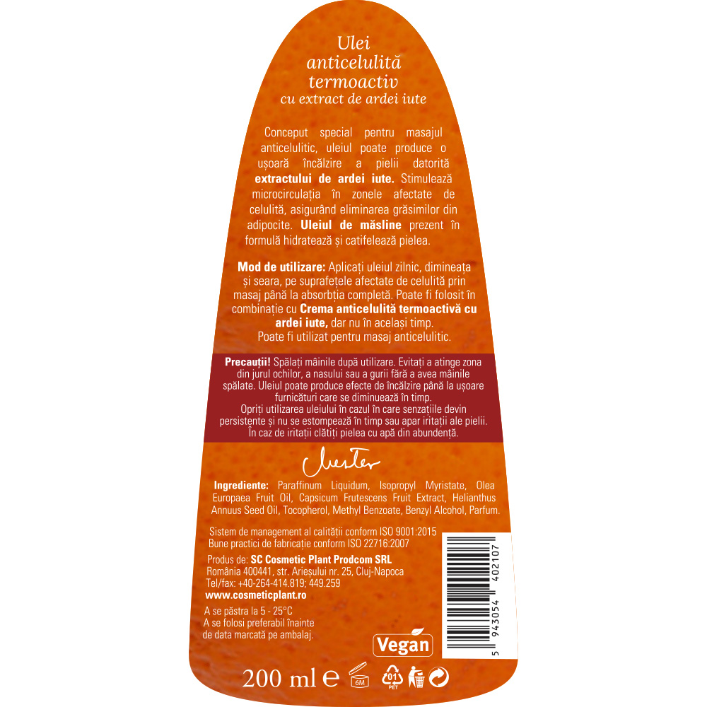Aplicati uleiul zilnic, dimineata si seara, pe suprafetele afectate de celulita prin masaj pana la absorbtia completa.