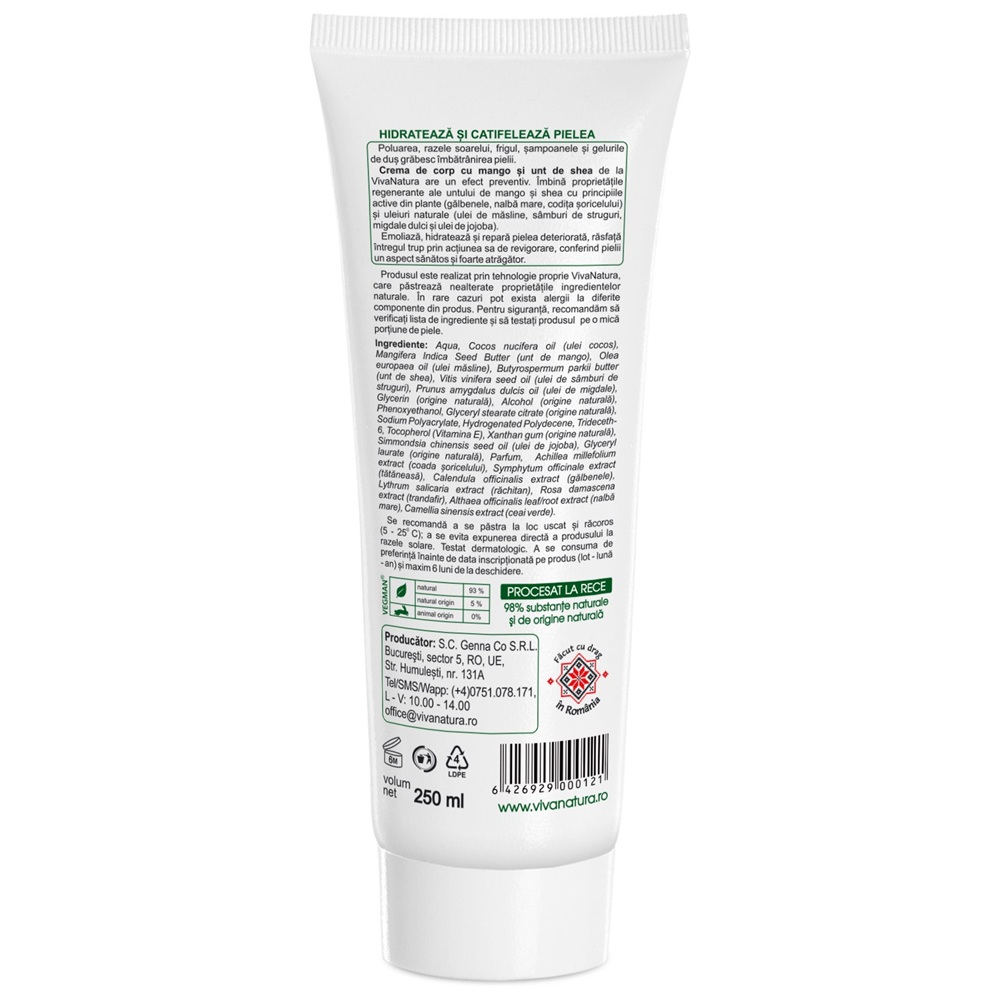 Aqua, Elaeis guineensis oil (ulei palmier), Mangifera Indica Seed Butter (unt de mango), Olea europaea oil (ulei măsline), Butyrospermum parkii butter (unt de shea), Vitis vinifera seed oil (ulei de samburi de struguri),Glycerin(vegetal), Alcohol (origine naturala), Phenoxyethanol, Glyceryl stearate citrate (origine naturala), Sodium Polyacrylate, Hydrogenated Polydecene, Trideceth-6, Prunus amygdalus dulcis oil (ulei de migdale),Tocopherol (Vit. E), Xanthan gum (natural), Simmondsia chinensis seed oil (ulei de jojoba), Glyceryl laurate (origine naturală), Parfum, Mangifera indica fruit extract (mango), Achillea millefolium extract (coada soricelului), Symphytum offIcinale extract(tataneasa), Calendula officinalis extract (galbenele), Lythrum salicaria extract (răchitan), Rosa damascena extract (trandafir), Althaea officInalis leaf/root extract (nalbă mare).