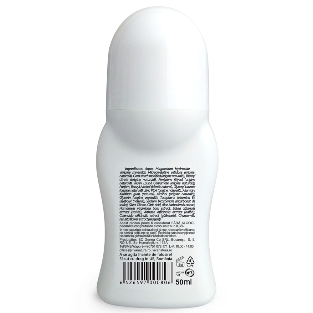 Aqua, Magnesium Hydroxide (origine minerală), Microcrystalline cellulose(origine naturală), Corn starch modified(origine naturală), Triethyl citrate(origine naturală), Pentylene Glycol(origine naturală), Inulin Lauryl Carbamate(origine naturală), Parfum, Benzyl Alcohol(identic natural), Glyceryl Laurate(origine naturală), Zinc PCA(origine naturală), Allantoin, Xanthan gum(natural), Alcohol(origine naturală), Glycerin(origine vegetală), Tocopherol(vitamina E), Bisabolol(natural), Silver Citrate, Citric Acid, Aloe barbadensis extract, Hamamelis virginiana bark extract, Salvia officinalis extract(salvie), Althaea officinalis extract (nalbă), Calendula officinalis extract(gălbenele), Chamomilla recutita flower extract(muşeţel).